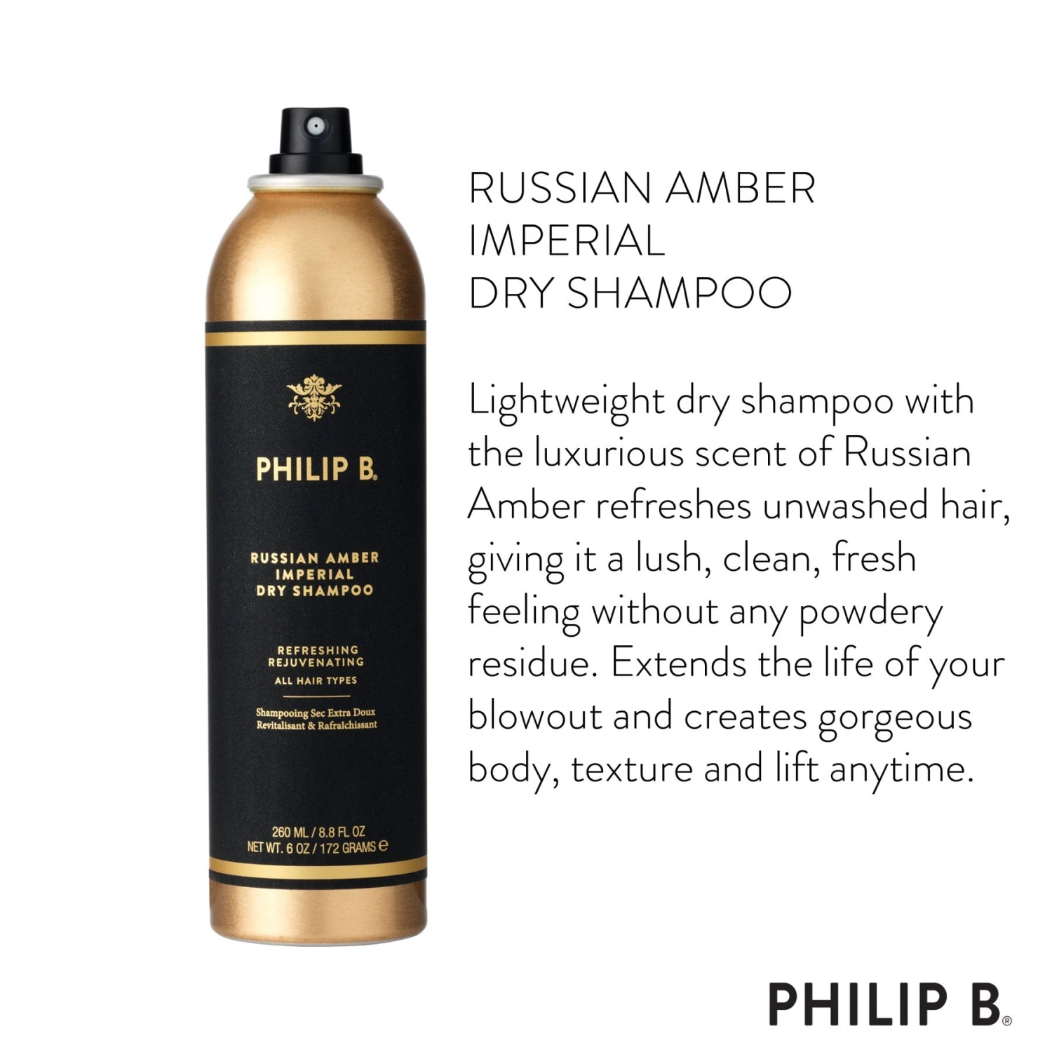 Lightweight dry shampoo with the luxurious scent of Russian Amber refreshes unwashed hair, giving it a lush, clean, fresh feeling without any powdery residue. Extends the life of your blowout and creates gorgeous body, texture and lift anytime.