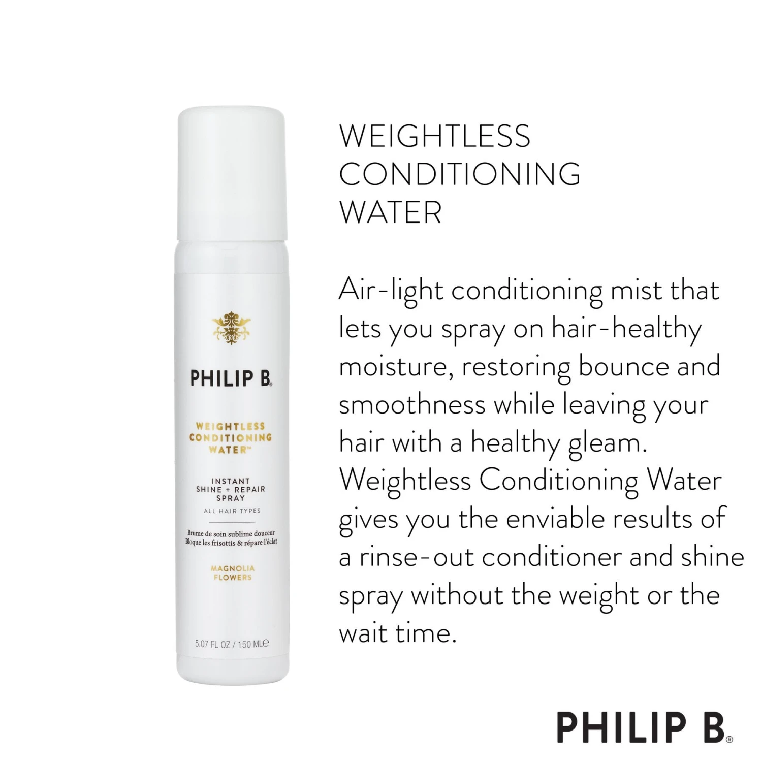 Weightless Conditioning Water gives you the enviable results of a rinse-out conditioner and shine spray without the weight or the wait time.