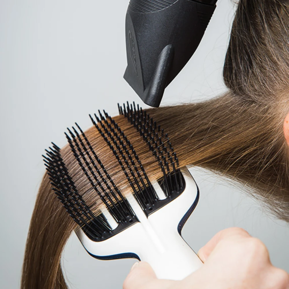 The Smoothing Tool is our innovative blow-drying hairbrush. Designed to take the hair from wet to dry, it has overlapping fixed base teeth with built-in tension and flexibility at the tips for a quick, smooth and gentle blow-dry without pulling or stretch-drying.